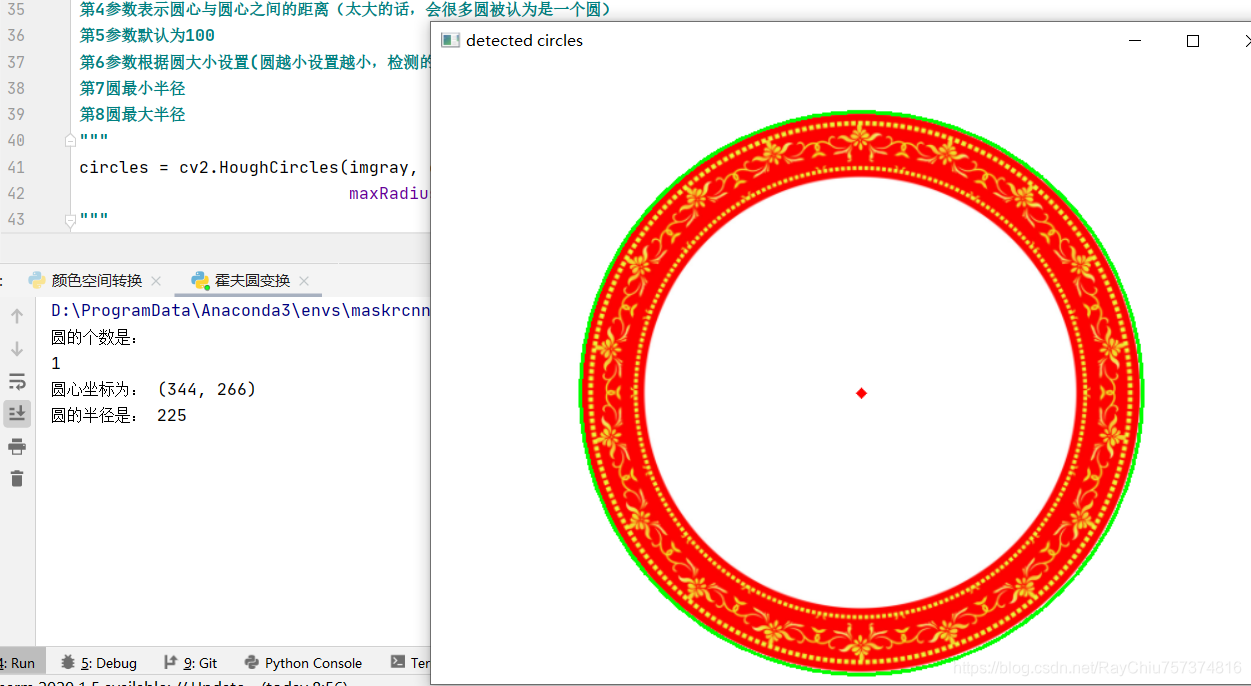 cv2.circle(img, (i[0], i[1]), i[2], (0, 255, 0), 2) # 第二参数()内是圆心坐标,第三参数是半径,第四参数()内是颜色,第五参数是线条粗细