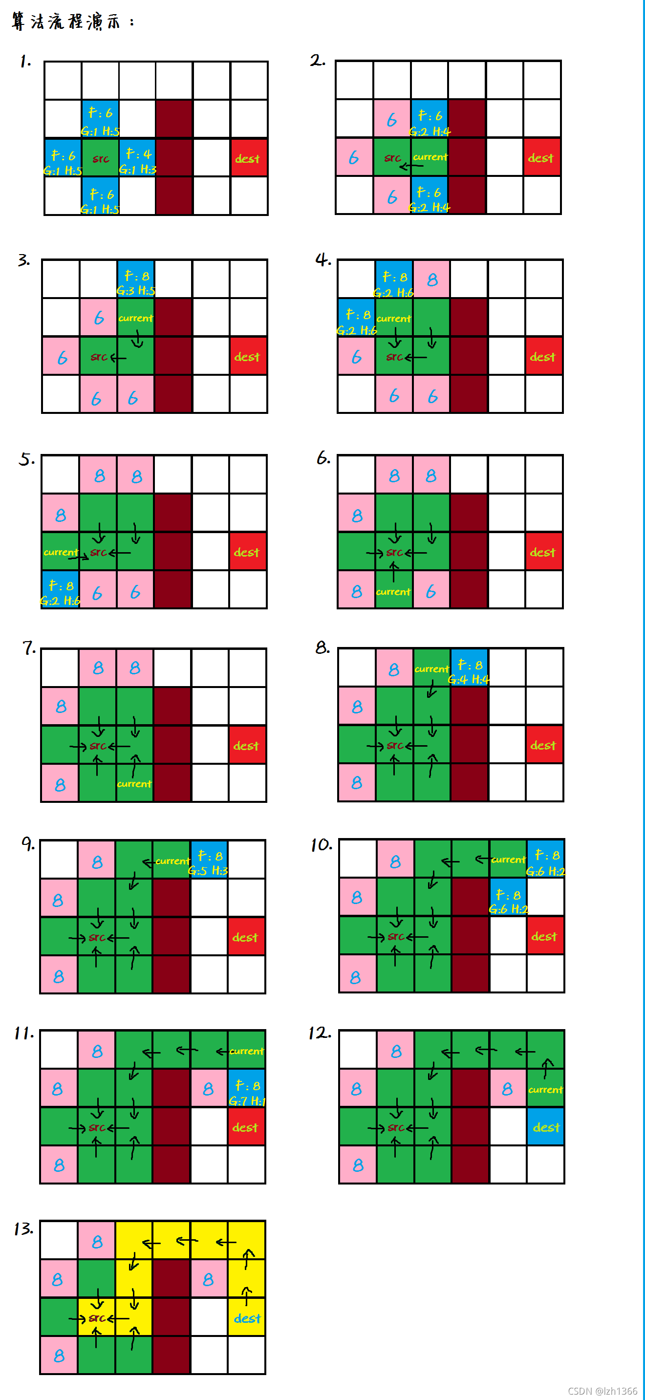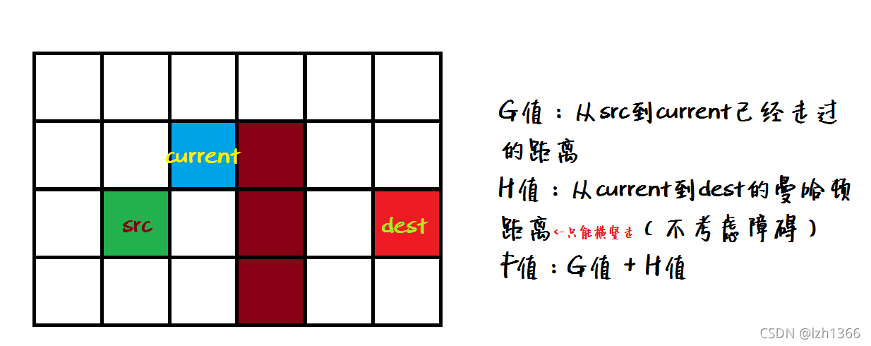 #H值为从当前点到终点的曼哈顿距离(不考虑障碍)