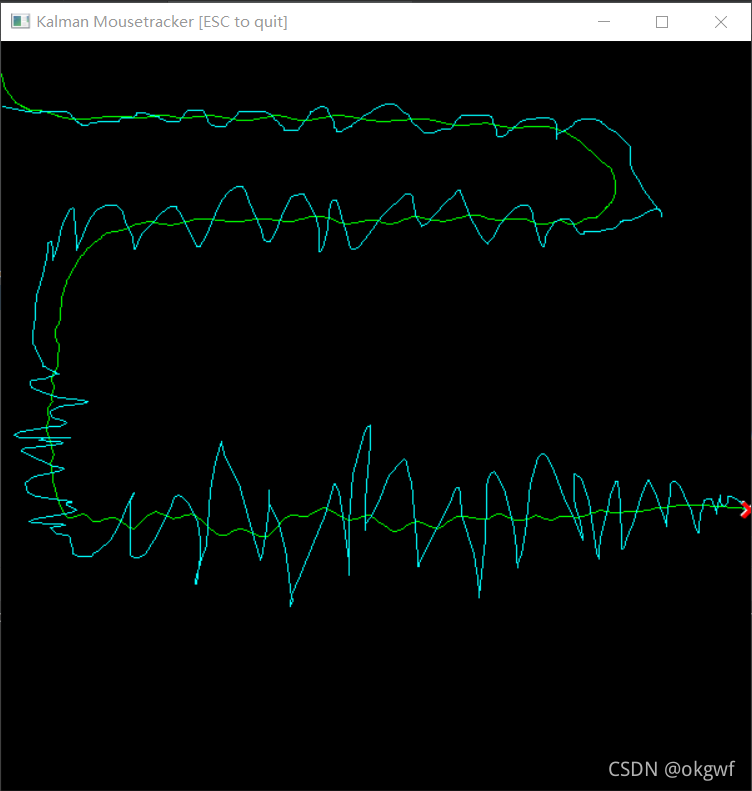?蓝色轨迹为鼠标移动轨迹, 绿色轨迹为模拟小车以鼠标位置为测量值的最优评估轨迹.