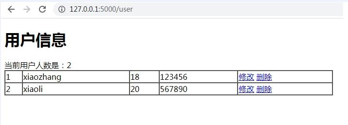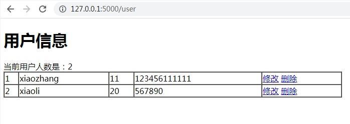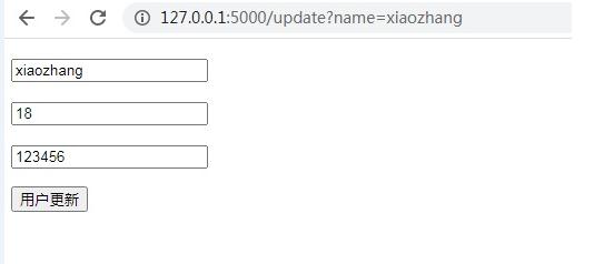 假设有两个用户的信息,在表中展示(分别为姓名,年龄,手机号),如下图:  支持修改及删除,点击修改时(假设只允许修改年龄及手机号),弹出如下图:  修改完,点击“用户更新”后,返回到127.0.0.1:5000/user页面