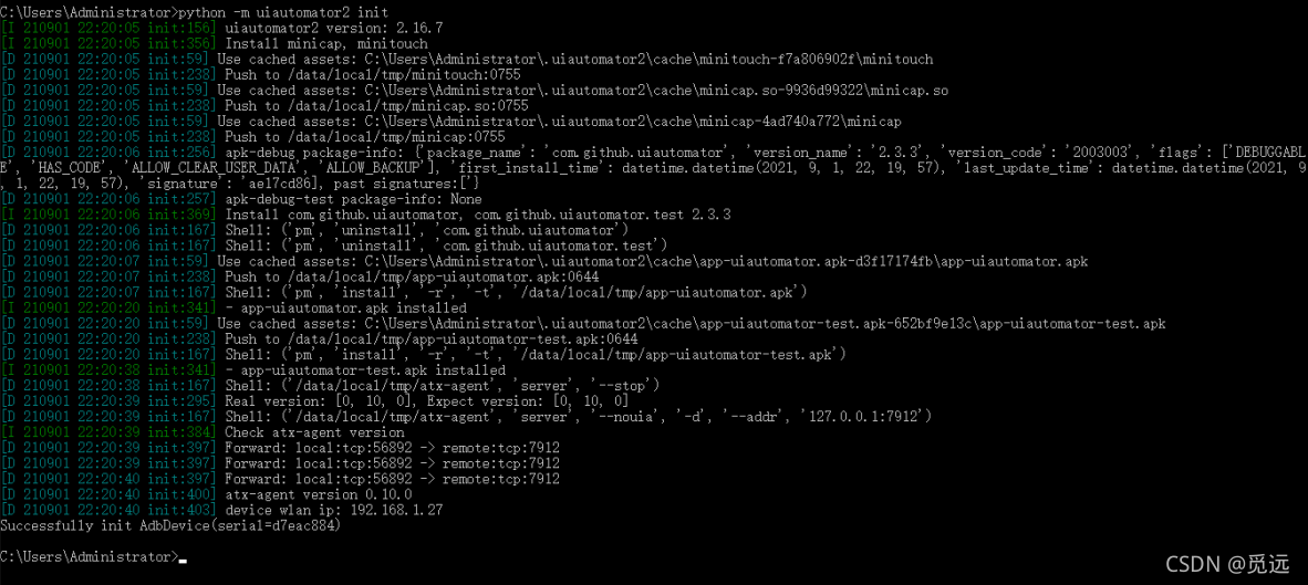提示“Successfully init AdbDevice(serial=d7eac884) ”表示安装成功