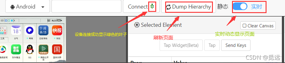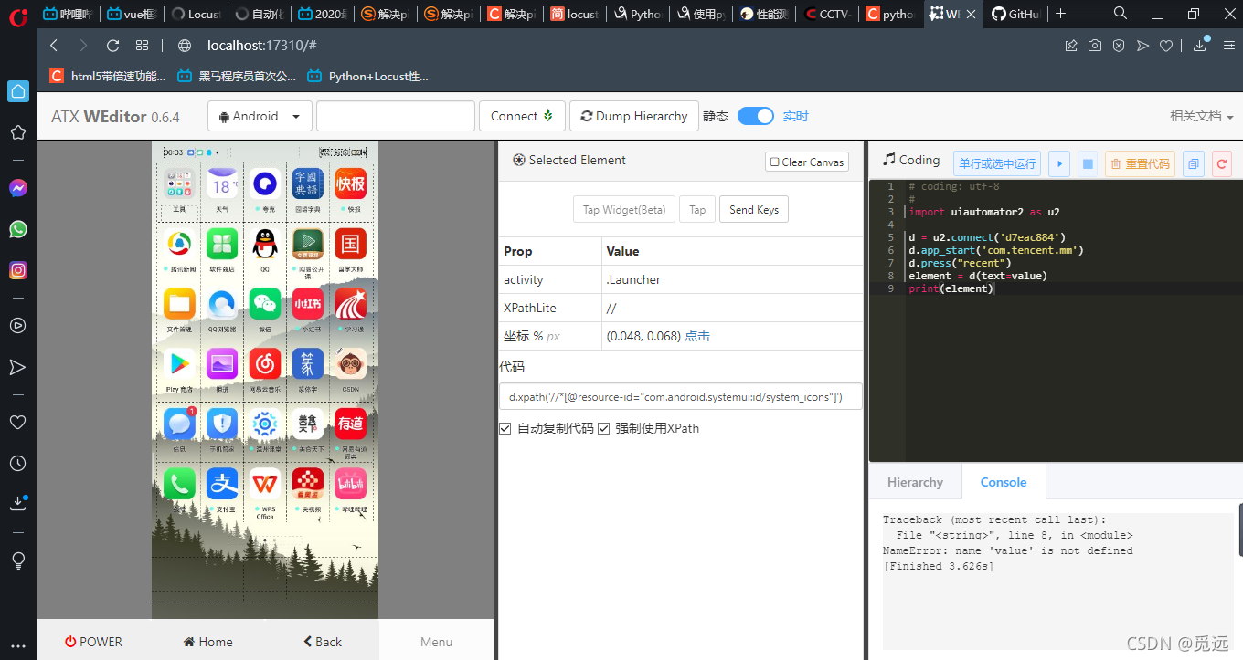 界面元素查找工具(python-App自动化数据配置及运行中有两种方法:Android Sdk包中的?uiautomateviewer?和 Appium Desktop 中的?Appium Inspector),前面这两种方法都需要链接数据线,但是在uiautomator2可以在同一局域网下无线操作,所以使用新的工具而不需要连接数据线更加方便。?uiautomator2提供了weditor工具来解决这个问题。