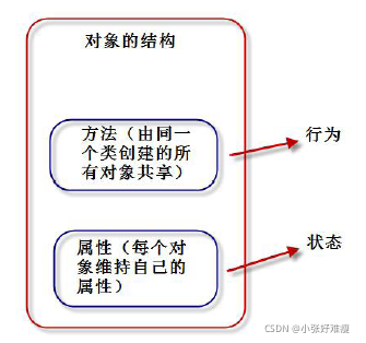 对象是类的具体实体,一般称为“类的实例”。 从一个类创建对象时,每个对象会共享这个类的行为(类中定义的方法),但会有自己的属性值(不共享状态)。更具体一点:“方法代码是共享的,属性数据不共享”。