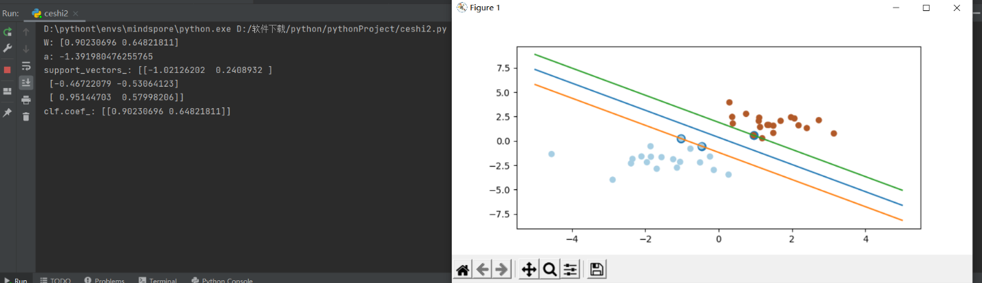 yy = a * xx - (clf.intercept_[0]) / w[1] # xx带入y,截距