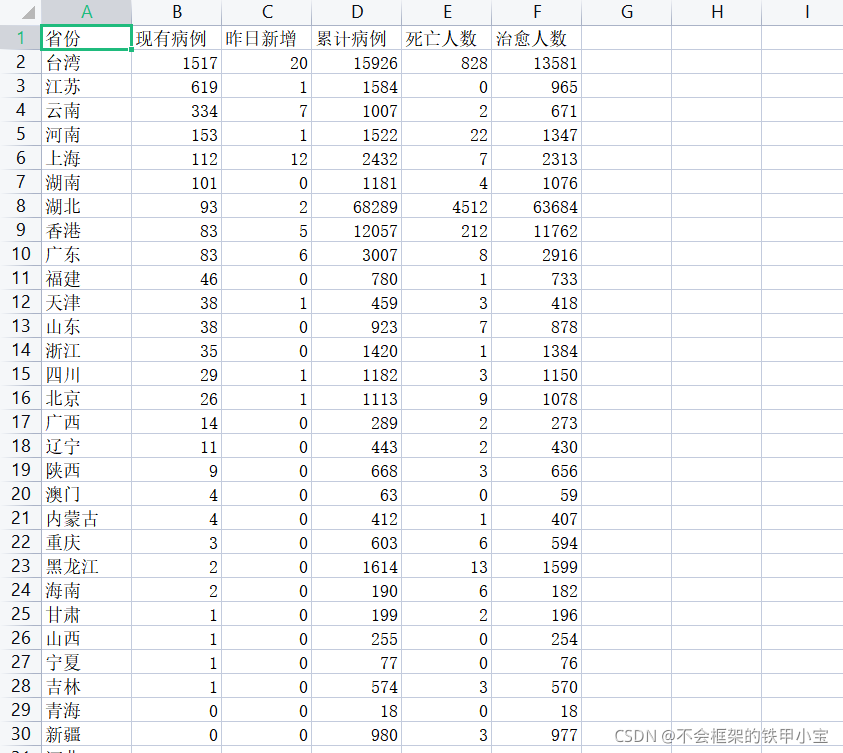 list1= ['省份','现有病例','昨日新增','累计病例','死亡人数','治愈人数']