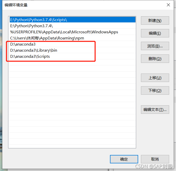 首先需要配置环境变量(我的电脑-属性-高级系统设置-环境变量-用户变量),双击Path,加入环境变量,如下图所示。