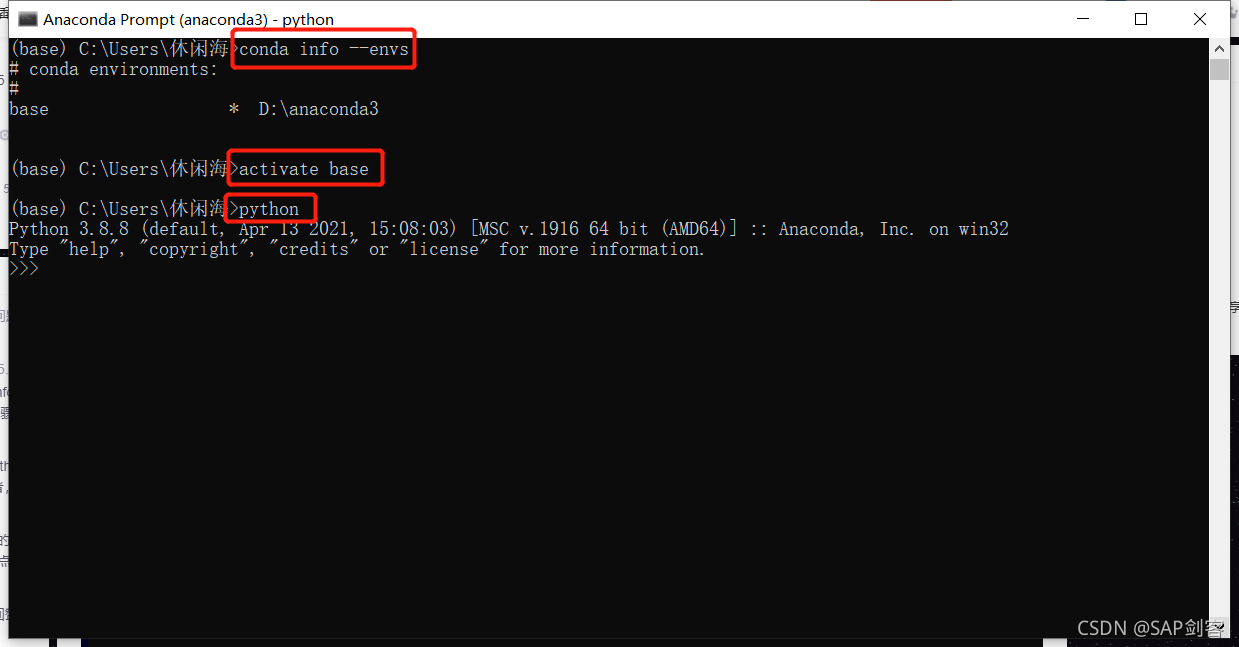首先在界面中依次输入“conda info --envs”和“activate base”来激活Anaconda。