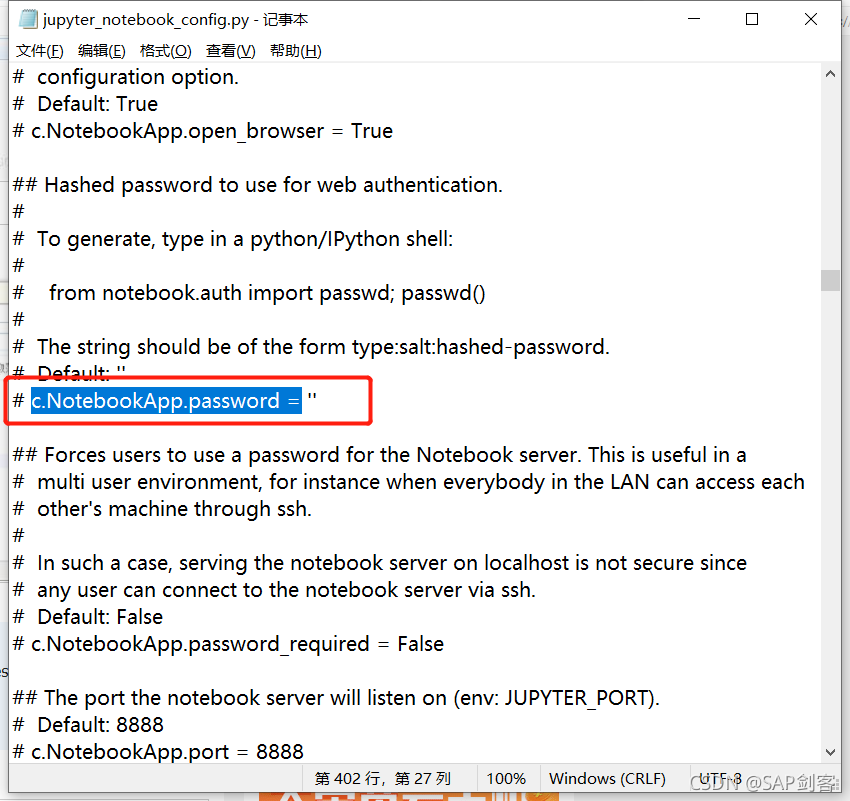 上述文件可以通过记事本打开编辑,“Ctrl+F”查找文本“c.NotebookApp.password =”。
