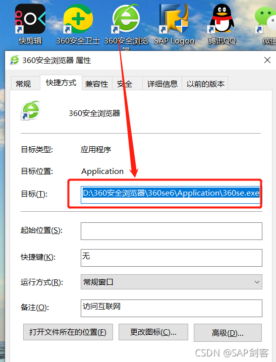 在上述语句后面插入如下图所示代码,本人使用的是360浏览器(安装路径可以在右键-属性中查看),注意路径之间用双斜杠分隔。