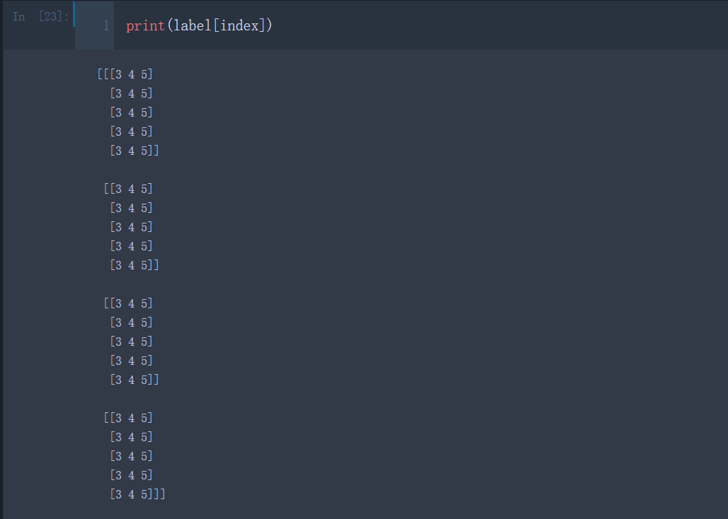 先看一下经过这种特殊索引后的shape  从这个shape可以看出,由于label[index]索引的时候并没有逗号,所以是对第一个维度的数据进行操作。再结合第二部分的资料就很好理解了:返回的数组与索引数组具有相同的形状,与原数组元素具有相同的类型和值(被索引位置)。资料中是针对的索引是一维数组的情况下。那么拓展一下,把一维(数组)拓展到二维(矩阵)。那么这条也是成立的。即把label原本(12,3)的shape的第一个维度拿出来,也就是12。被(4,5)的矩阵索引后。12这个维度就变成了(4,5)。其他维度不变。所以shape是(4,5,3)。那么这个(4, 5,3)的矩阵里面究竟是什么呢?通过之前学到numpy高级索引很容易就得到结果了。就是将index里的每一个元素的值(我这里设置的是1)当做label第一个维度(也就是行)进行索引。所以组成的(4,5,3)这个矩阵里全部由label中第二行(0对应第一行,1对应是第二行)组成。