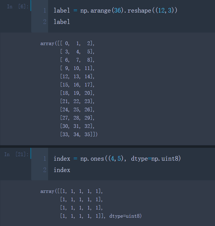 首先定义数组,label模拟上面的cm(color map),index模拟上面的pre_label((352,480)的矩阵),但是我这边设置这么大的矩阵不利于查看结果,所以我只设置了(4,5)的矩阵,方便后面查看结果。