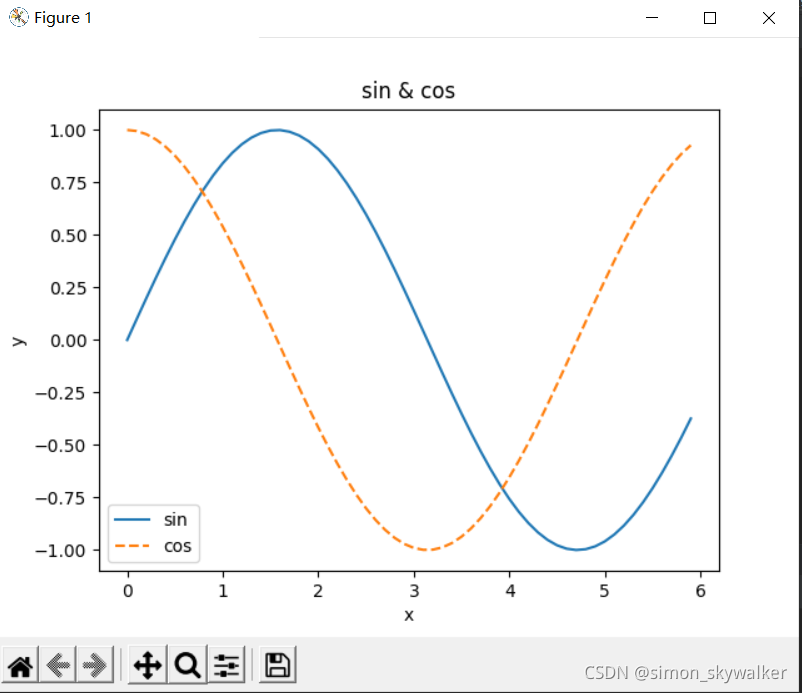 x = np.arange(0, 6, 0.1) # 以0.1为单位,生成0到6的数据