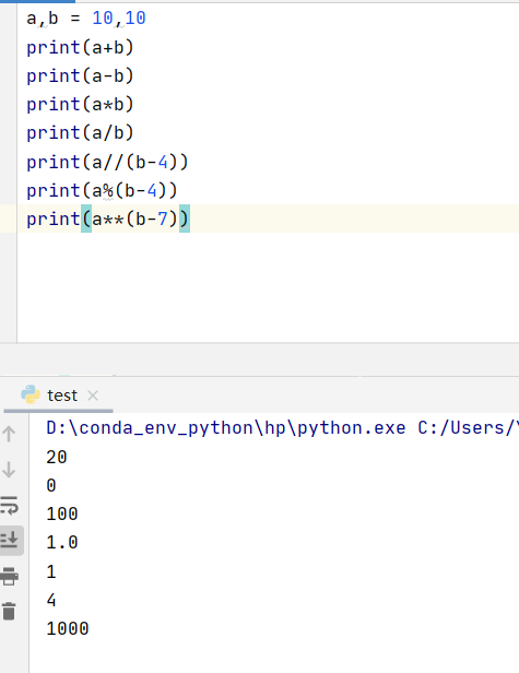 + | 加 | a,b=10,10 a+b=2 | - | 减 | a,b=10,10 a-b=0 | * | 乘 | a,b=10,a*b=100 | / | 除 | a,b=10,10 a/b=0 | // | 取整 | a,b=10,6 a//b=1 | % | 取余 | a,b=10,6 a//b=4 | ** | 幂 | a,b=10,3 a**b=1000 |
