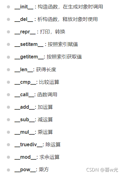 类的私有方法 __private_method:两个下划线开头,声明该方法为私有方法,只能在类的内部调用 ,不能在类的外部调用。self.__private_methods。