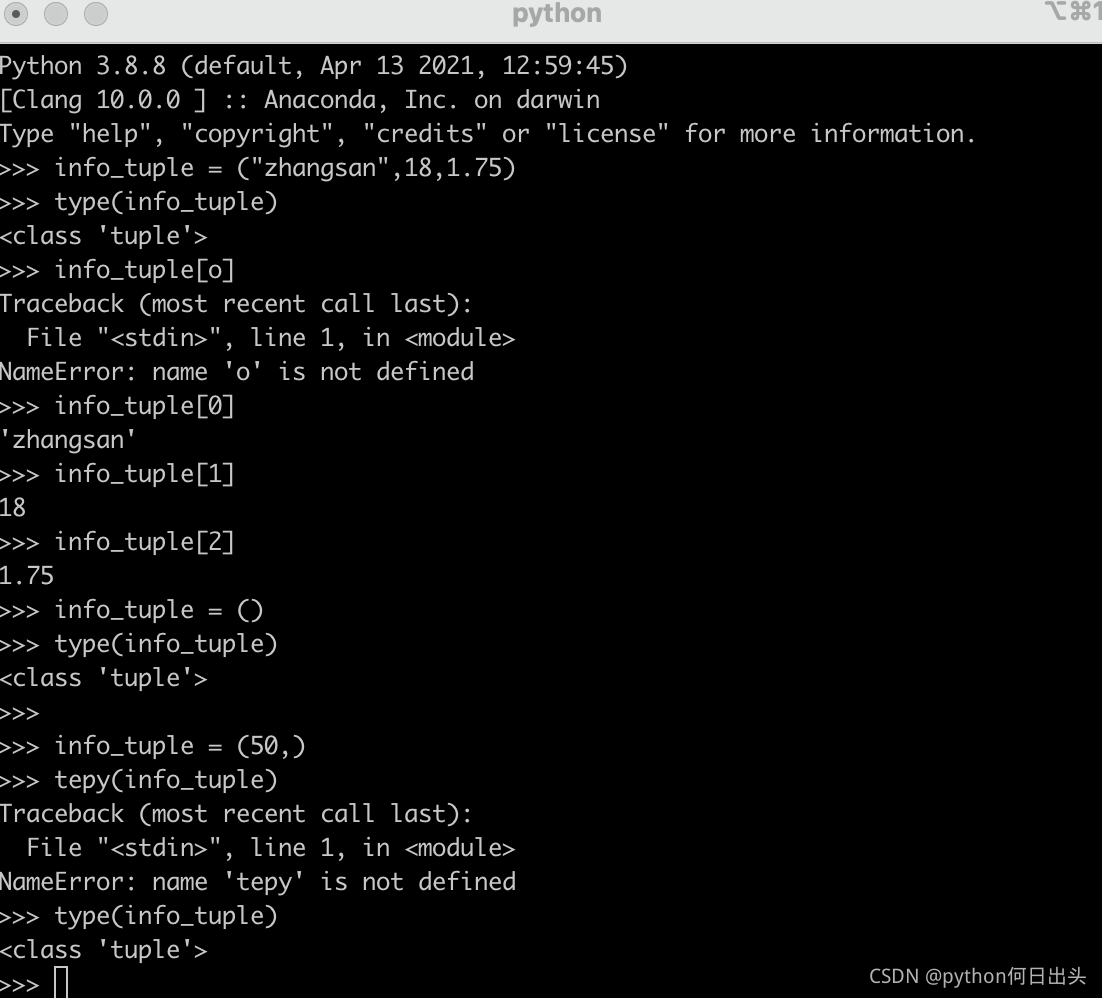 - ?创建空元组:info_tuple = () ? 注意:在开发中很少使用空元组,因为变量一旦定义完成,将无法修改。