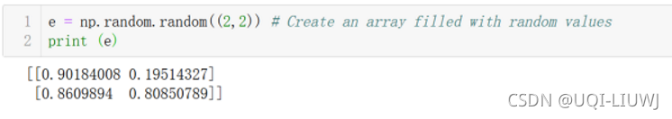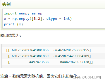 np.array(object,dtype=…) | 用object创建ndarray  ? | empty(shape,dtype=) | 指定形状&类型,元素值均为随机值  | zeros(shape,dtype=) | 填充0  | ones | 填充1  | full(shape,num,dtype) | 用num填充shape大小的数组  | eye(num,dtype) 等同于identity(num,dtype) | num*num的单位矩阵   | random.random(shape,dtype) |  | diag | 当?np.diag(array)?中 array是一个1维数组时,结果形成一个以一维数组为对角线元素的矩阵 array是一个二维矩阵时,结果输出矩阵的对角线元素  | empty_like(x) | 创建一个形状和x一样的,数值随机  | arange(start, stop, step, dtype) |  ??  | linspace | 创建一个等差数列 ? ? | logspace | 创建一个等比数列  ? |