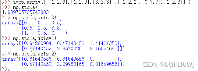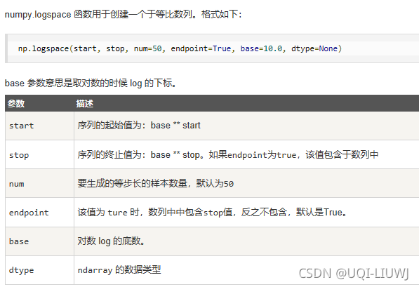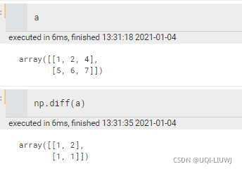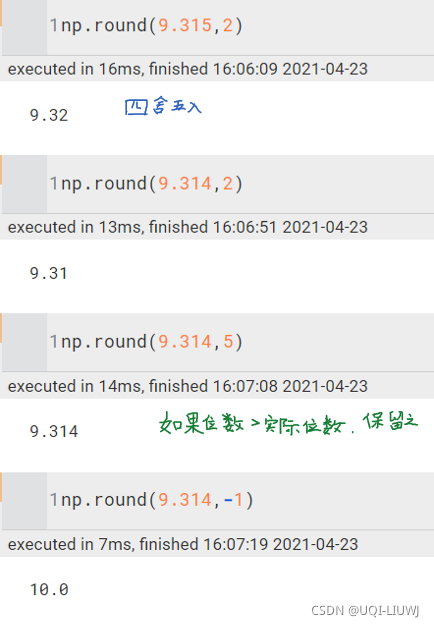 ?  b——正序 -b——倒序 如果是多维的话(默认是最大的一个axis) Axis=0 a[..][0][0],a[…][0][1],a[…][0][2] a[..][1][0],a[…][1][1],a[…][1][2]  Axis=1 a[0][…][0],a[0][…][1],a[0][…][2]  Axis=2同理  | np.c_ | 按行连接两个矩阵,就是把两矩阵左右相加,要求行数相等   注意和hstack的区别,hstack里面是把一行的向量作为一行来看的,r_里面是当作一列来看待的  | concatenate | 和vstack,hstack差不多,不过用axis来指定是行还是列  axis=1 行——a[0][......] axis=0 列——a[......][0] | copy |  这个是真copy,不是view | clip | 截取数组中在min和max之间的部分,比min小的置为min,比max大的置为max  | cumsum/cumprod | 括号是几——第几维度累加/累乘(a[][][][]里面的第几个,从左往右) 括号里是0:原第一行=原第一行 ? 原第二行=原第二行+原第一行 ? 原第三行=原第三行+原第二行+原第一行 括号里是1:列的操作 没有字母,所有元素,一个一个叠加  | diff | 类差运算  | flatten | 返回一份数据拷贝,对拷贝所做的修改不影响原始数组  F风格:按列展开 flat 一个迭代器  | np.isin(a,b) | ?用于判定a中的元素在b中是否出现过,如果出现过返回True,否则返回False,最终结果为一个形状和a一模一样的数组。  和np.where搭配使用,效果更好(np.where返回True的坐标)  分别是我找到的1的第一维坐标和第二位坐标 | nditer | 按照ndarray在内存中的存储顺序逐个访问  a和a转置在内存中的存储顺序一样——他们的遍历顺序一样  默认order=’C‘行优先 ——order=“F’(fortran 列优先)? | meshgrid(ndarray,ndarray) | 返回坐标方格的X与Y x和y都是二维数组,分别是这些点的横坐标/纵坐标  | mean/average | 计算平均数,加axis就是某一个轴, 比如axis=0,就是每一列一个平均数(a[;;;][0],a[,,,,][1],…..,)  average只能是np.average  | newaxis | 添加一个维度  感觉还是reshape靠谱一点 | np.r_ | 按列连接两个矩阵,就是把两矩阵上下相加,要求列数相等  注意和vstack的区别,vstack里面是把一行的向量作为一行来看的,r_里面是当作n行来看待的  | ravel | 和flatten差不多,唯一的区别是,修改会影响原始数组  | reshape |  | resize | 如果一样大的话和a.reshape()差不多 shape比a的尺寸小的话,那就是截取   如果尺寸大的话,会把a的元素按照a的顺序补进去  | np.round | round( number ) 函数会返回浮点数 number 的四舍五入值 具体定义为 round(number[,digits]): 如果 digits>0 ,四舍五入到指定的小数位; 如果 digits=0 ,四舍五入到最接近的整数; 如果 digits<0 ,则在小数点左侧进行四舍五入; 如果 round() 函数只有 number 这个参数,则等同于 digits=0。  | split | 等量对分 (axis=0 a[1~n][0]会被等分到各个里面去) 一定是等量,不等量的话会报错   vsplit=split(axis=0) hsplit=split(axis=1) | array_split | 不等量分割  | np.sin | 逐元素取sin | std | 计算标准差 Axis=0——计算a[…][0][0],a[…][0][1],…的标准差  | squeeze | 删除单维度条目  | tolist | 转换为list  | triu(data,k) | 以data为数据,创建一个上三角矩阵,k表示这个上三角的边接往上/下移动几条线的距离  | tile | np.tile(a,(2))函数的作用就是将函数将函数沿着X轴扩大两倍。如果扩大倍数只有一个,默认为X轴   np.tile(a,(2,1))第一个参数为Y轴扩大倍数,第二个为X轴扩大倍数。本例中X轴扩大一倍便为不复制。   | np.timedelta(num,'x') |  计算两个datetime中间差多少时间间隔(向下取整)【Y、M、W、D、h、m、s、ms、us、ns】 | 转置 |   | where | numpy.where()?有两种用法: 1. np.where(condition, x, y) 满足条件(condition),输出x,不满足输出y。 2. np.where(condition) 只有条件 (condition),没有x和y,则输出满足条件 (即非0) 元素的坐标。 这里的坐标以tuple的形式给出,通常原数组有多少维,输出的tuple中就包含几个数组,分别对应符合条件元素的各维坐标。  |