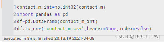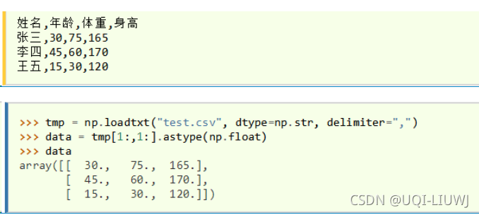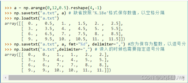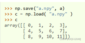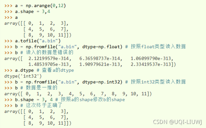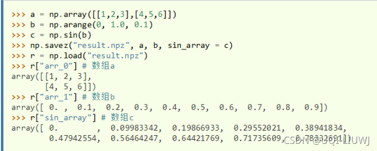 tofile() & fromfile() | tofile()将数组中的数据以二进制格式写进文件 tofile()输出的数据不保存数组形状和元素类型等信息 fromfile()函数读回数据时需要用户指定元素类型,并对数组的形状进行适当的修改  读入数据的时候,需要设置正确的dtype参数,并且修改属组的shape属性,才会得到和原始数据一致的结果 sep参数:tofile 和 fromfile中数值的分隔符 | save() & load() | NumPy专用的二进制格式保存数据,它们会自动处理元素类型和形状等信息  | savez() | 将多个数组保存到一个文件中 savez()的第一个参数是文件名,其后的参数都是需要保存的数组  ?没有起名的话就是'arr_0","arr_1",....起来名字的就是所起的名字 | ndarray写入csv | 先转化成DataFrame  | savetxt() & loadtxt() |