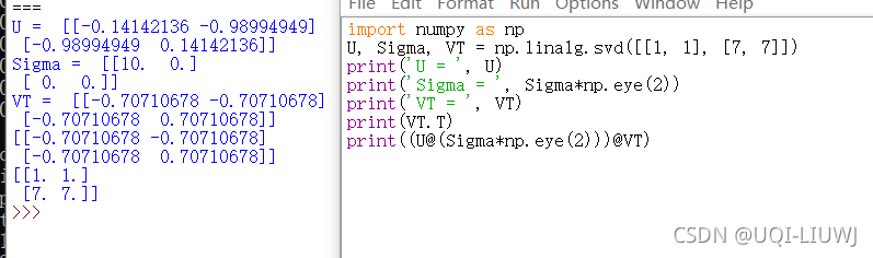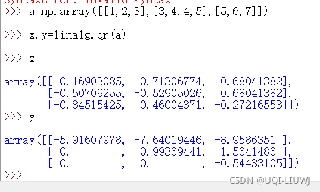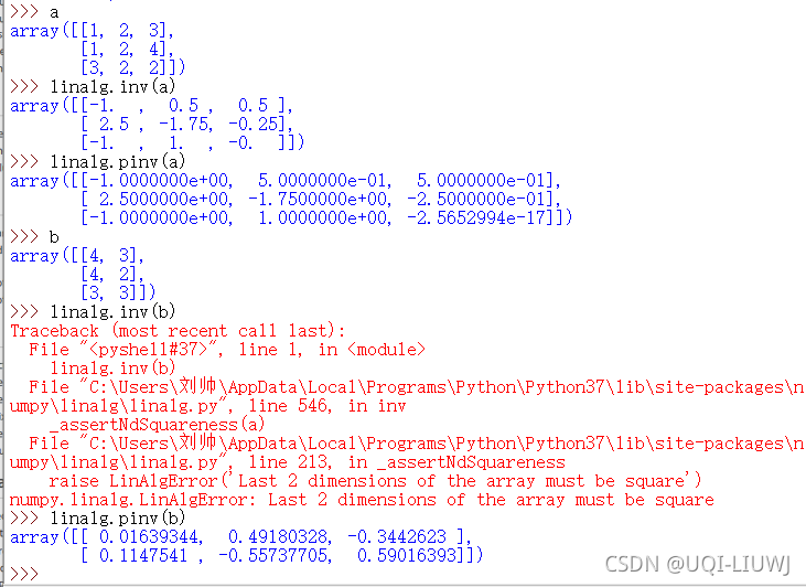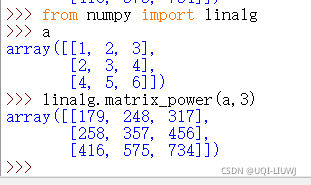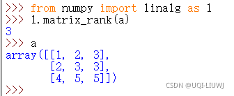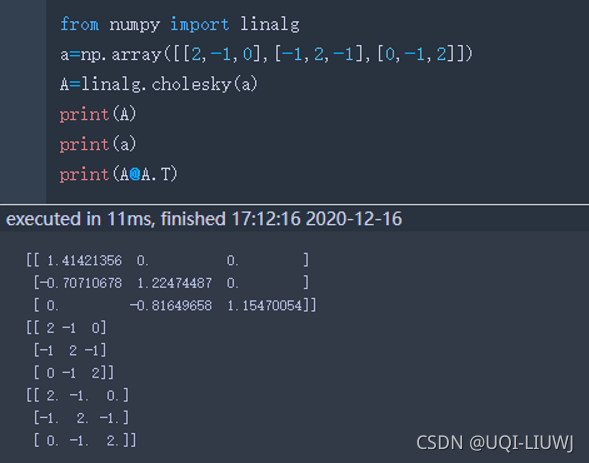 matrix_power | 矩阵的n次方  | cholesky | 对称正定矩阵A——存在一个对角元为正数的下三角矩阵L,A=LL^T x=linalg.cholesky(A),出来的结果是A的L  | qr | QR分解 任何一个满秩矩阵,都可以用qr分解 一个正交矩阵和一个上三角矩阵  | svd | SVD分解(一般用于降维  U,V——m,n阶方阵 Σ——除了对角线元素,都是0,对角线元素——奇异值  numpy出来的奇异值是从大到小排列的,所以直接切片就可以了 | eig | 求特征值和特征向量  每一列就是一个特征向量 | det | 求行列式  | matrix_rank | 计算矩阵的秩  | solve | Solve(a,b)_解ax=b的x  | inv,pinv | 计算矩阵的逆/伪逆  |