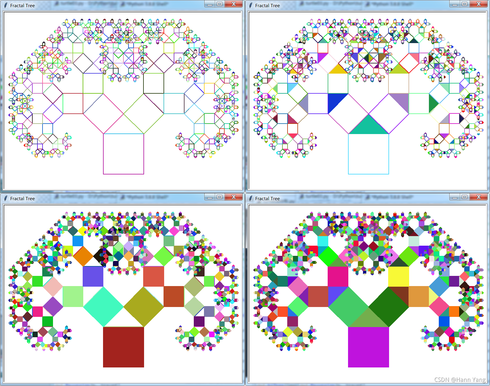 上一篇《Turtle库画一棵对称勾股树,美丽惊艳的分形世界!》中描绘了一棵对称的双色勾股树,详情见:Python Turtle库画一棵对称勾股树,美丽惊艳的分形世界!_汉阳Hann's Home-CSDN博客 分形,具有以非整数维形式充填空间的形态特征。通常被定义为“一个粗糙或零碎的几何形状,可以分成数个部分,且每一部分都(至少近似地)是整体缩小后的形状”,即具有自相似的性质。分形(Fractal)一词,是芒德勃罗创造出来的,其原意具有不规则、支离破碎等意义。1973年,芒德勃罗(B.B.Mandelbrot)在法兰西学院讲课时,首次提出了分维和分形的设想。 分形是一个数学术语,也是一套以分形特征为研究主题的数学理论。分形理论既是非线性科学的前沿和重要分支,又是一门新兴的横断学科,是研究一类现象特征的新. https://blog.csdn.net/boysoft2002/article/details/120466255