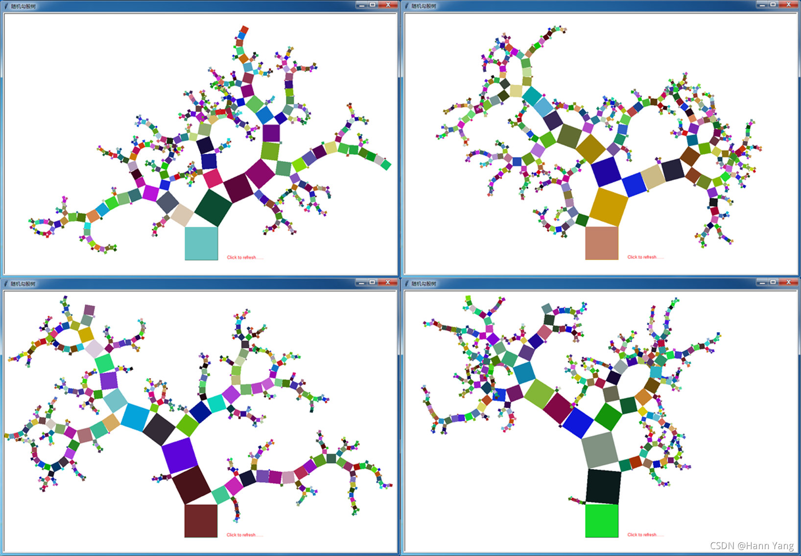 左右偏向角都是45度勾股树就是对称的,那么角度指定从列表[i for i in range(5,86)]中抽取,勾股树的“树枝”就能任意角度生长了。参考网上的代码,增加了 onclick 事件,这样就可以反复观察效果。类似于 tkinter 库中用 .bind(<事件>,方法) 绑定函数来增加对象的事件动作,当然turtle窗口中也能使用bind方法(之后再作研究讨论)。经过修改后效果如下: