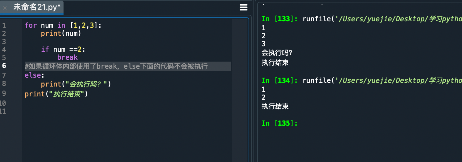 ? 公共方法——完整的for循环语法在python中完整的 for 循环的语法如下: for 变量 in 集合 ? ? ? 循环体代码 else 没有通过 break 退出循环,循环结束后会执行的代码 只有要遍历的集合从头到尾遍历完成,else下方的代码才会被执行,一旦在循环体内部使用了break,就意味着集合没有遍历完后,else下方的代码就不会被执行