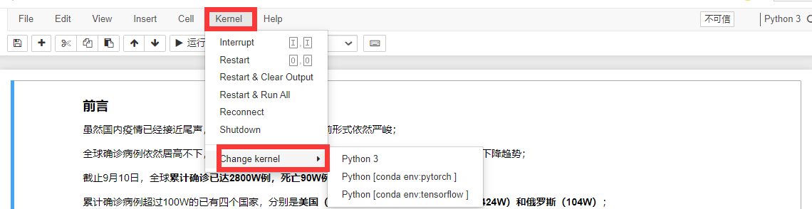 python -m ipykernel install --user --name xxx --display-name "Python [conda env:xxx]" (随即可以在jupyter notebook中切换,如下)