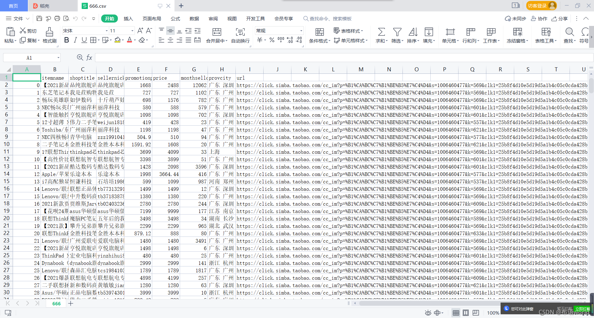 itemname,shoptitle,sellernickname,promotionprice,price,monthsellcount,provcity,url=[],[],[],[],[],[],[],[]