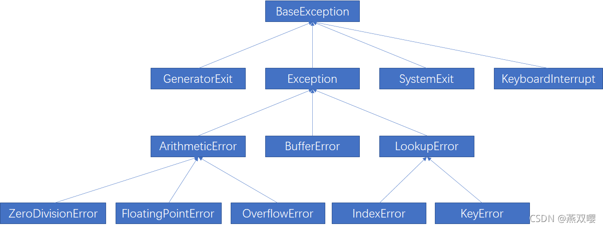 Python的所有异常类都从BaseException派生而来,提供了丰富的异常类,这些异常类之间有严格的继承关系。