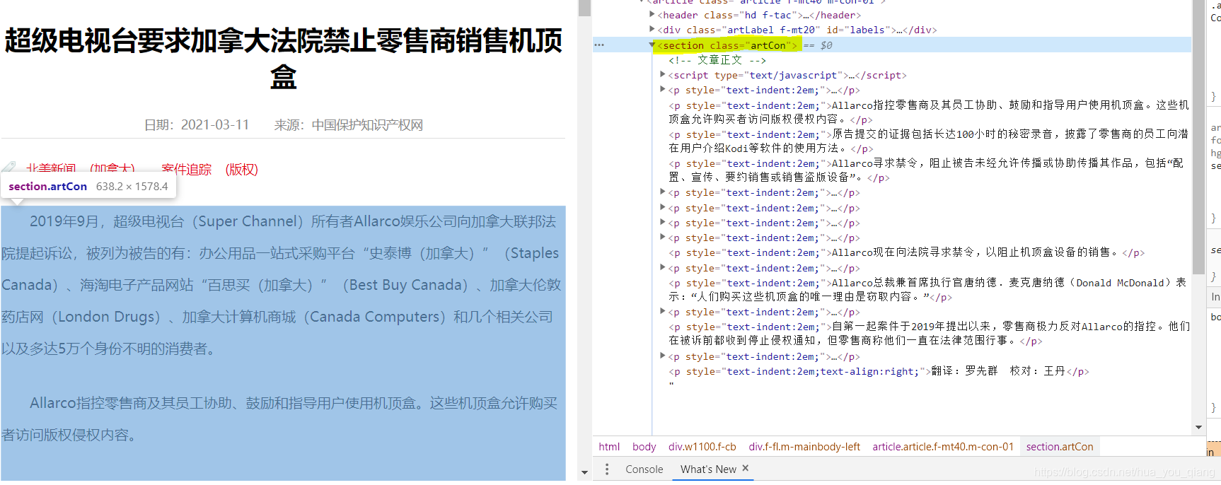定位到文章内容,可以发现在section class=“artCon” 包含我们所爬取的内容