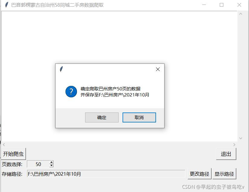 if tkinter.messagebox.askokcancel("", "确定爬取巴州房产" + str(page) + "页的数据\n并保存至" + path.get(), default="cancel"):