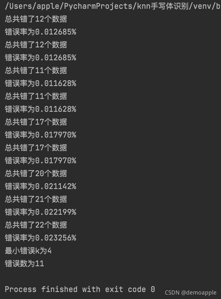 Modify: ?? ?2017-03-25 """ if __name__ == '__main__': ? ? kmini = 10000 ? ? kmx = 0 ? ? for kx in range(1, 10): ? ? ? ? knew = handwritingClassTest(kx) ? ? ? ? if kmini >= knew: ? ? ? ? ? ? kmini = knew ? ? ? ? ? ? kmx = kx print("最小错误k为%d\n错误数为%d" % (kmx, kmini)) ?