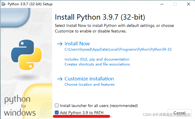 一定要选上加入Python到环境变量 如果忘记选上可以到最后一步重新添加环境变量