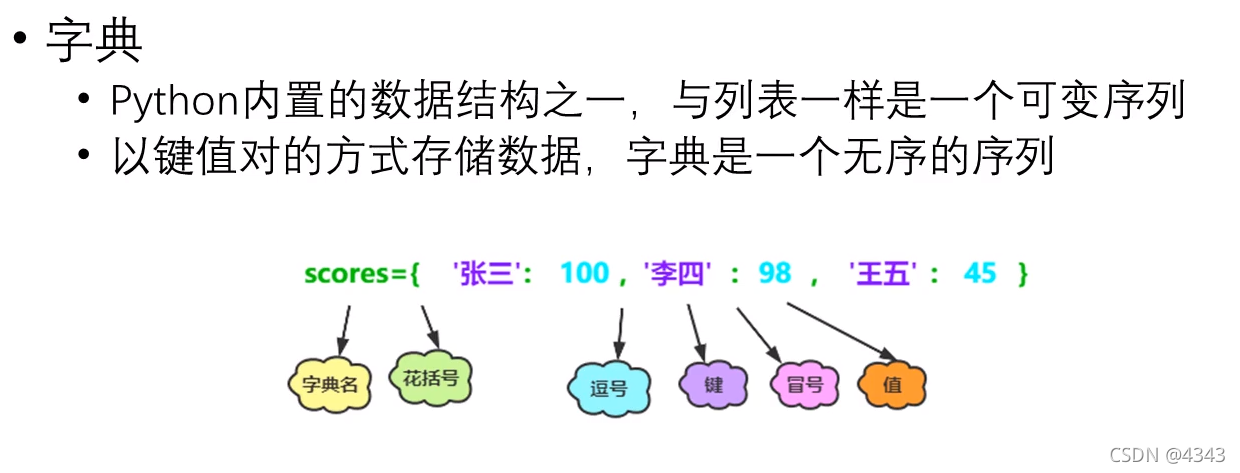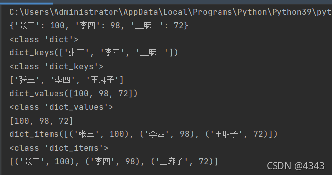 scores = {'张三':100 ,'李四':98 ,'王麻子':72}