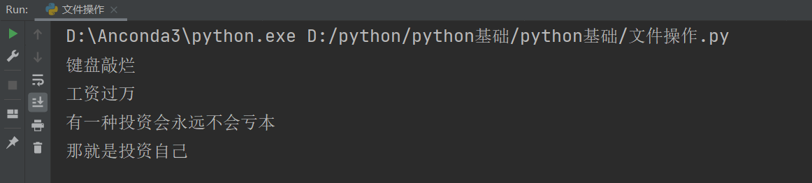 例子:以w(只写入模式,如果没有改文件,则新创建一个文件)模式打开test.txt文件,并写入内容:键盘敲烂,工资过万