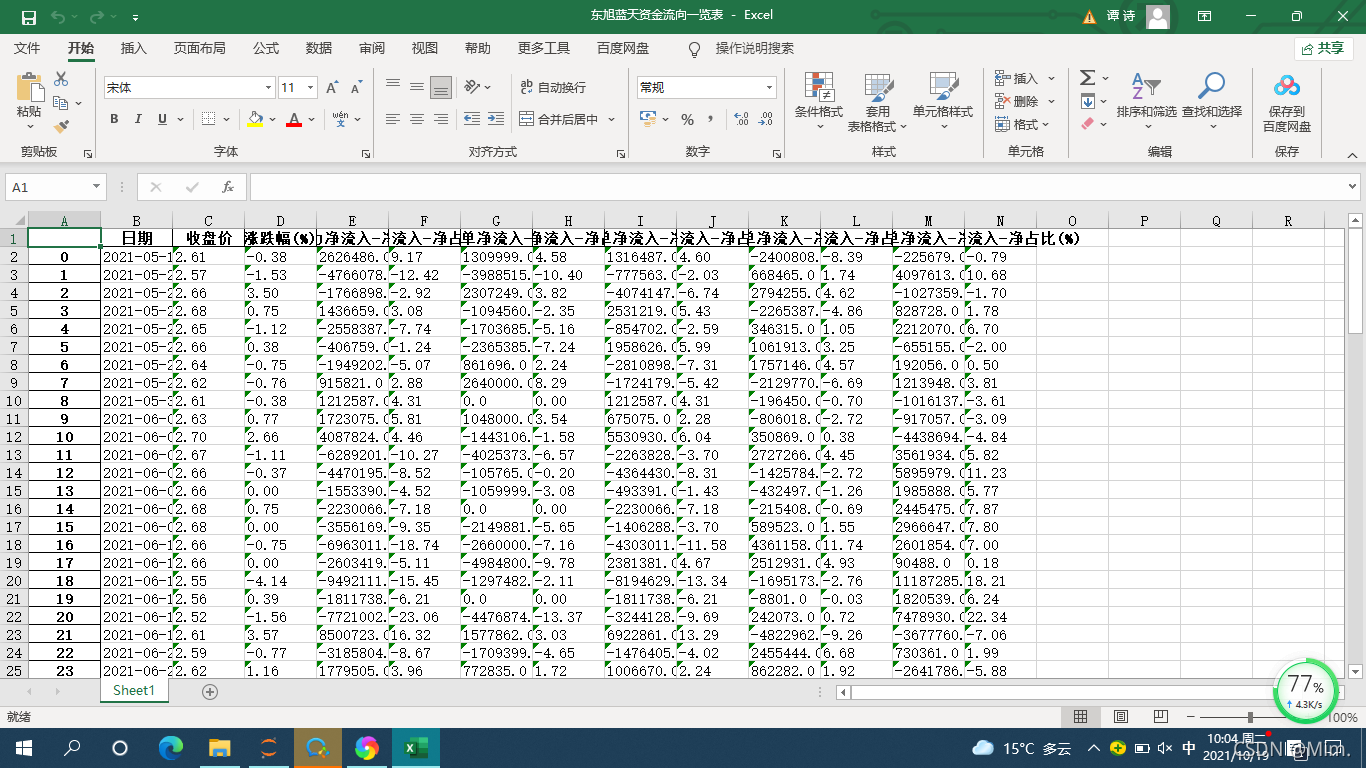 将爬取出的东旭蓝天资金流向数据存到excel表中,得到表格的部分截图如下: