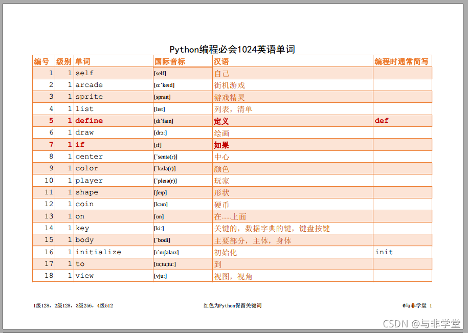 单词 | 意义 | 编程时通常简写 | about | 关于 | | above | 在……上方 | | absent | 缺少的,不在 | | absolute | 绝对的;绝对值 | abs | abstract | 抽象的 | | academy | 学术,学院 | | access | 访问,进入 | | account | 账户 | | accurate | 准确的 | | across | 穿过,经过 | | action | 行动,动作 | | activate | 激活 | | active | 活跃的 | | actor | 角色,演员 | | add | 加 | | address | 地址 | | adjust | 调整 | | adult | 成年的,成人 | | advance | 提前,高级的 | | adventure | 冒险 | | after | 在……之后 | | again | 再,又 | | age | 年龄 | | ahead | 提前的 | | aim | 目标 | | air | 空气 | | algorithm | 算法 | | align | 对齐 | | all | 所有的 | | allow | 允许 | | along | 沿着 | | alpha | 阿尔法,透明通道 | | already | 已经 | | also | 也 | | alter | 改变 | | amount | 数量 | | anchor | 锚点 | | and | 并且,和 | | angle | 角度 | | animal | 动物 | | animate | 使动起来,活跃 | | animation | 动画 | anim | another | 另外的 | | answer | 答案 | | any | 任何的 | | anything | 任何的 | | appear | 出现 | | append | 添加 | | apple | 苹果 | | application | 应用程序 | | apply | 应用 | | arbiter | 仲裁人,决定者 | | arc | 弧 | | arcade | 街机游戏 | | archive | 档案 | | argument | 参数 | arg | armor | 盔甲 | | around | 周围的 | | array | 数组 | | arrow | 箭头 | | artwork | 艺术品 | | as | 作为…… | | ascii | 美国信息交换标准代码 | | ask | 询问 | | assert | 确定 | | asset | 素材,资源,资产 | | assign | 部署(动词) | | assignment | 部署(名词),任务 | | at | 在…… | | attach | 附加在上面 | | attack | 攻击 | | attempt | 企图做 | | attract | 吸引 | | attribute | 属性 | attr | audio | 音频 | | author | 作者 | | automatically | 自动地 | | available | 可以获取的,可以访问的 | | average | 平均 | avg | avoid | 避免 | | away | 离开的,远离的 | | axis | 轴 | | back | 后面 | | background | 背景 | bg | backward | 向后 | | bad | 坏的 | | bag | 袋子 | | ball | 球 | | base | 基准(名词),以……作为基础(动词) | | basic | 基本的 | | basket | 篮球 | | because | 因为 | | before | 在……之前 | | begin | 开始 | | behavior | 行为动作 | | below | 在……下方 | | better | 更好的 | | between | 在……之间 | | big | 大的 | | binary | 二进制的,二元的 | bin | bingo | 成功了!对了 | | bird | 鸟 | | birthday | 生日 | | bisect | 二分 | | bit | 二进制位,binary digit | | bitmap | 位图 | | black | 黑色 | | blit | 位块传送,block transfer | | block | 阻止(动词),模块(名词) | | blue | 蓝色 | | body | 主要部分,主体,身体 | | bold | 粗体的 | | bool | 布尔值,是非的 | | border | 边框 | | boss | 老板 | | both | 两个都 | | bottom | 在下面 | | bounce | 弹跳 | | bound | 绑定的,范围,界限 | | boundary | 范围,界限 | | box | 盒子 | | break | 损坏,中断(循环) | | bright | 明亮的 | | broadcast | 广播 | | buffer | 缓冲物 | | build | 建筑,构建 | | bullet | 子弹 | | but | 但是 | | button | 按钮 | | by | 依靠,由…… | | byte | 字节 | | cache | 缓冲区,缓存 | | calculate | 计算 | calc | call | 调用,呼唤 | | callable | 可调用的 | | callback | 回调(函数) | | camera | 摄像机,镜头 | | can | 能够 | | cannon | 大炮(名词),碰撞(动词) | | canvas | 画布 | | capital | 大写字母,头,首脑,主要的 | | caption | 标题 | | capture | 抓取,捕获 | | card | 卡片,扑克 | | careful | 仔细的 | | case | 情况,案例 | | cat | 猫 | | cause | 原因(名词),引起(动词) | | cco | 与非学堂域名缩写codingclass.online | | ceil | 屋顶,向上取整 | | center | 中心 | | certain | 一定的,当然的 | | chain | 链条,前后连接在一起 | | change | 变化 | | character | 角色,汉字 | chr, char | charge | 收费,负责,充电 | | check | 检查 | | cheese | 奶酪 | | child | 孩子 | | choice | 选择(名词) | | circle | 圆 | | city | 城市 | | class | 类,种类,班级 | | clear | 清除,清空 | | click | 点击 | | client | 客户端 | | climb | 爬行 | | clock | 时钟 | | close | 关闭(动词),接近的(形容词) | | club | 俱乐部 | | code | 代码,规范 | | coin | 硬币 | | collect | 收集 | | collide | 碰撞 | | color | 颜色 | | column | 列 | col | combine | 组合 | | comment | 注释,评论 | | common | 公共的,共同的 | | compare | 对比,比较 | | compile | 编译 | | compress | 压缩 | | computer | 计算机 | | concatenate | 拼接 | concat | condition | 条件 | | configuration | 配置 | config | connect | 连接 | | constant | 常量 | const | constructor | 构造器 | | contact | 合同(名词),收缩(动词) | | contain | 包含 | | container | 容器 | | content | 内容 | | context | 上下文,语境 | | continue | 继续 | | control | 控制 | | convert | 转换 | | coordinate | 坐标(名词),协调(动词) | | copy | 复制 | | copyright | 版权 | | corner | 角落 | | cosine | 余弦 | cos | cost | 花费 | | costume | 造型 | | count | 计数 | | counter | 计数器 | | country | 国家 | | couple | 一对;耦合 | | crate | 木箱 | | create | 创造,建立 | | credit | 信任 | | critical | 关键的 | | cube | 立方体 | | current | 当前的 | | currently | 现在 | | cursor | 鼠标指针 | | customer | 顾客 | | customized | 自定义的 | | dance | 跳舞 | | dark | 黑色 | | data | 数据 | | database | 数据库 | db | date | 日期 | | day | 一天 | | dead | 死的,不活跃的 | | debug | 调试 | | decimal | 十进制的 | | declare | 声明 | | decode | 解码 | | decorate | 装饰 | | decrease | 减少 | | default | 默认的,缺省的 | | define | 定义 | def | degree | 度数 | | delay | 延迟 | | delete | 删除 | del | demo | 演示 | | density | 密度 | | depth | 深度 | | description | 描述 | | destination | 目标 | dest | destroy | 破坏 | | detail | 