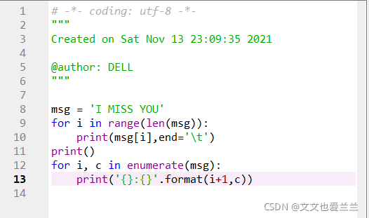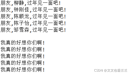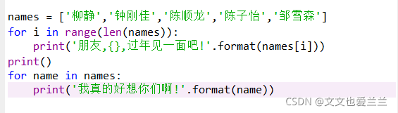 msg = 'I MISS YOU' for i in range(len(msg)): ? ? print(msg[i],end='\t') print() for i, c in enumerate(msg): ? ? print('{}:{}'.format(i+1,c)) ? ?? names = ['柳静','钟刚佳','陈顺龙','陈子怡','邹雪森'] for i in range(len(names)): ? ? print('朋友,{},过年见一面吧!'.format(names[i])) print() for name in names: ? ? print('我真的好想你们啊!'.format(name))