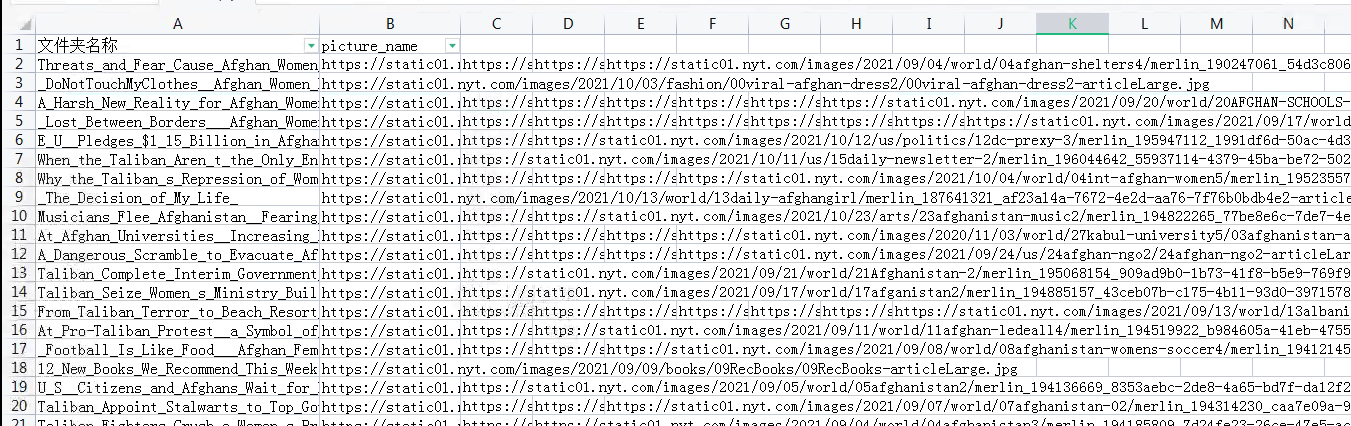需求:读Excel中第一列作为文件夹名,第二列开始都是图片链接,图片链接可以有多条,每一行可以图片链接数不一,把每一行的图片下载到指定文件夹中。 test.xlsx例如:
