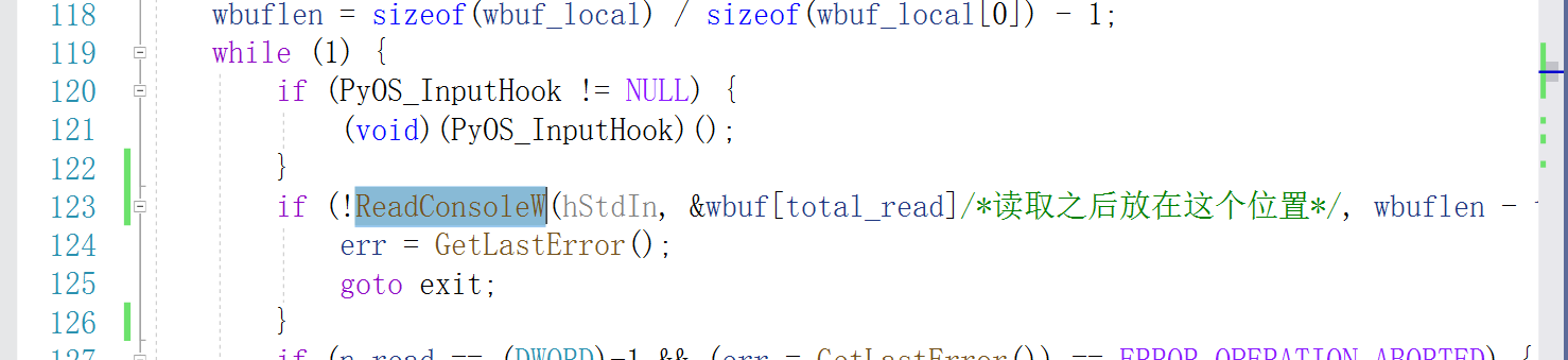 通过这个函数,我们成功把写入的字符串读取了出来。 之后我们再看一下文件中的其它函数 _PyOS_WindowsConsoleReadline---line 102 ReadConsoleW的第一层封装,所做的工作是将读出的字符串转化为utf-8格式。 PyOS_StdioReadline---line 217 第二层封装,在_PyOS_WindowsConsoleReadline函数前面加入了fflush函数,该函数的作用是将缓冲区中的内容强制写入指定位置(stdin:输入端|stdout:输出端|stderr:错误输出端)。然后直接返回_PyOS_WindowsConsoleReadline的值。注意到,在return后面还有几十行代码,目前用不到,因此不再考虑 PyOS_Readline---line 330 第三层封装,为PyOS_StdioReadline加了一把“锁”,保证了一次只有一个线程能访问该控制台,或者说,是stdin,stdout和stderr中的内容,防止多线程会造成的混乱。 除了这三个函数,还有一个函数,叫做my_fgets,这个函数的作用就是用于在中断错误之后重启fgets函数。这个函数只出现在第二层封装的函数里,也就是我说的在return后面的那几十行代码里,还不知道能干点啥,所以先跳过。 现在我们终于理解了整个myreadline.c文件所要做的事情,感觉就是一个工具类,给谁都能用,没什么价值。那么PyOS_Readline传出的字符串下一站会到哪里去了呢? |