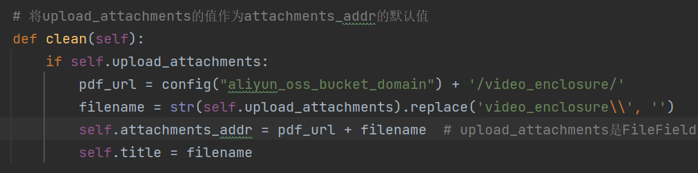 我有三个字段,标题和附件地址,以及一个用来上传文件的字段,之前我将上传文件得到的标题和外网完整访问地址重新赋值给了标题和附件地址,作为他们的默认值。这并没有问题,很正常。 但当我后续想要手动修改标题或者附件地址,或者不上传文件,手动填写标题或地址的时候,无法生效,程序任然使用默认值,并不能修改,并且如果不上传文件,则无法修改,必须上传。 解决: 1、我对文件上传字段做了修改,添加了blank=True和null=True。 blank=True,允许填写表单的时候为空。 null=True,允许字段在数据库中可以为空。