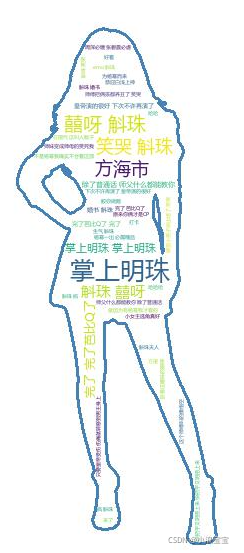 ? ? ? ? ?你可能会问,Image.open?中,‘./’ 代表什么意思,'./' 在我的理解里,就是程序所在文件夹地址,我在程序所在文件夹里创建了一个“杨幂”的文件夹,并使用了其中的一张图片作为遮罩。在里做遮罩图片的时候,我其实并没有使用过 wordcloud?这个库,也是突发奇想,想做一个词云。在B站,看了教程视频,教程里讲,让我做一张透明图片,一直都不好用,做不成遮罩。又去查了很多资料,最后发现有人说是用纯白色图片,试了试,果然是。别人讲的不一定是对的,只有自己真正去做了才知道真假。如果你想一秒钟,抠出图片人物,私聊我,我教你!(点个赞呗,都看到这了,怪辛苦的)。
