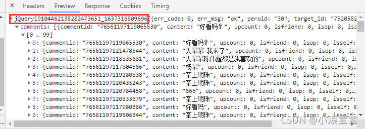? ? ? ? 3)删除 callback 参数。你可能要问,为什么要删除 callback 参数,而不删除其他参数。 jQuery 是一个简洁而快速的JavaScript库,可用于简化事件处理,HTML文档遍历,Ajax交互和动画,以便快速开发网站。在预览要爬取的数据过程中,可以看到,在 json格式 数据外面套了一层JQuery 代码,为了方便我们直接获取其中 json格式 的数据,删除此参数即可。由于视频(以第一集为例)为51分56秒(3116秒),所以截取了前3015秒进行爬取弹幕。将剩下的查询字符串以字典的形式放在变量 params 里作为参数传入 session.get??,问号前面的直接放入 session.get??;
