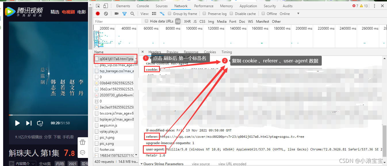 ? ? ? ? __init__()? 方法在之前的文章已经说过了,它是类的初始化方法,在类的实例过程中都会被执行一次。本程序中主要用来,保持 cookie 传递给后续的请求,让登录状态在多个请求之间共享。cookie 就好比是自己QQ密码,千万要保护好!,并且设置全局的请求头数据。使用 user-agent 将爬虫伪装成浏览器,user-agent 里包含了操作系统、浏览器类型、版本等信息。使用 referer 使我们假装由腾讯视频网页发起的请求,在爬取数据的过程中,还可以加其他的信息。