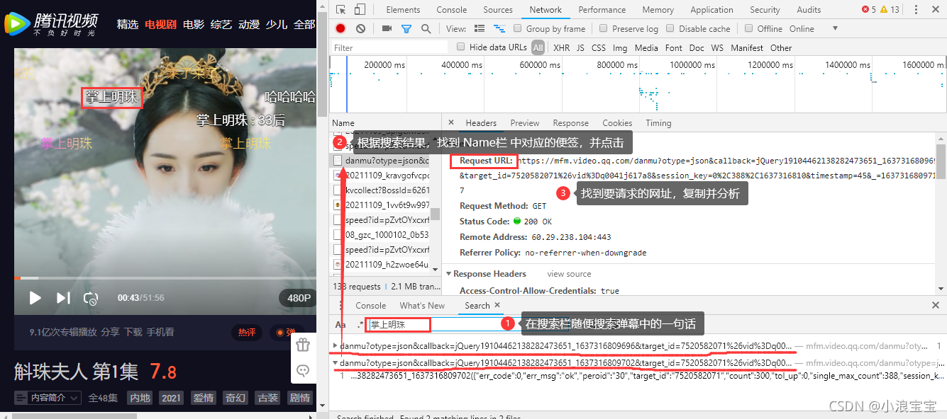 ? ? ? ? 1)打开 “开发者工具”,让视频播一会,然后随便搜索 弹幕中 的一句话 ——> 根据搜索结果,找到 Name栏 中对应得便签,并点击 ——> 复制要请求的网址(URL),并分析;