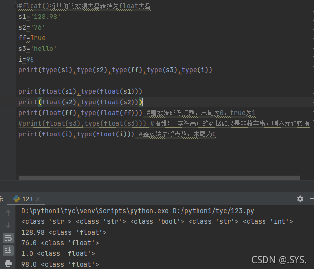 函数名 | 作用 | 注意事项 | 举例 | str() | 将其他数据类型转换成字符串 | 也可用引号转换 | str(123) '123' | int() | 将其他数据类型转换成整数 | 1.文字类和小数类字符串,无法转换成整数 2.浮点数转化成整数,抹零取整 | int('123') int(9,8) | float() | 将其他数据类型转换成浮点数 | 1.文字类无法转成整数 2.整数转成浮点数,末尾为0 | float('9,9') float(9) |