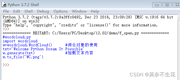 #wordcloud.py import wordcloud w=wordcloud.WordCloud() ? ? ?#词云对象的使用 txt='Welcome Python Dream It Possible' w.generate(txt) ? ? ? ? ? ? ?#加载文本内容 w.to_file('WC.png')