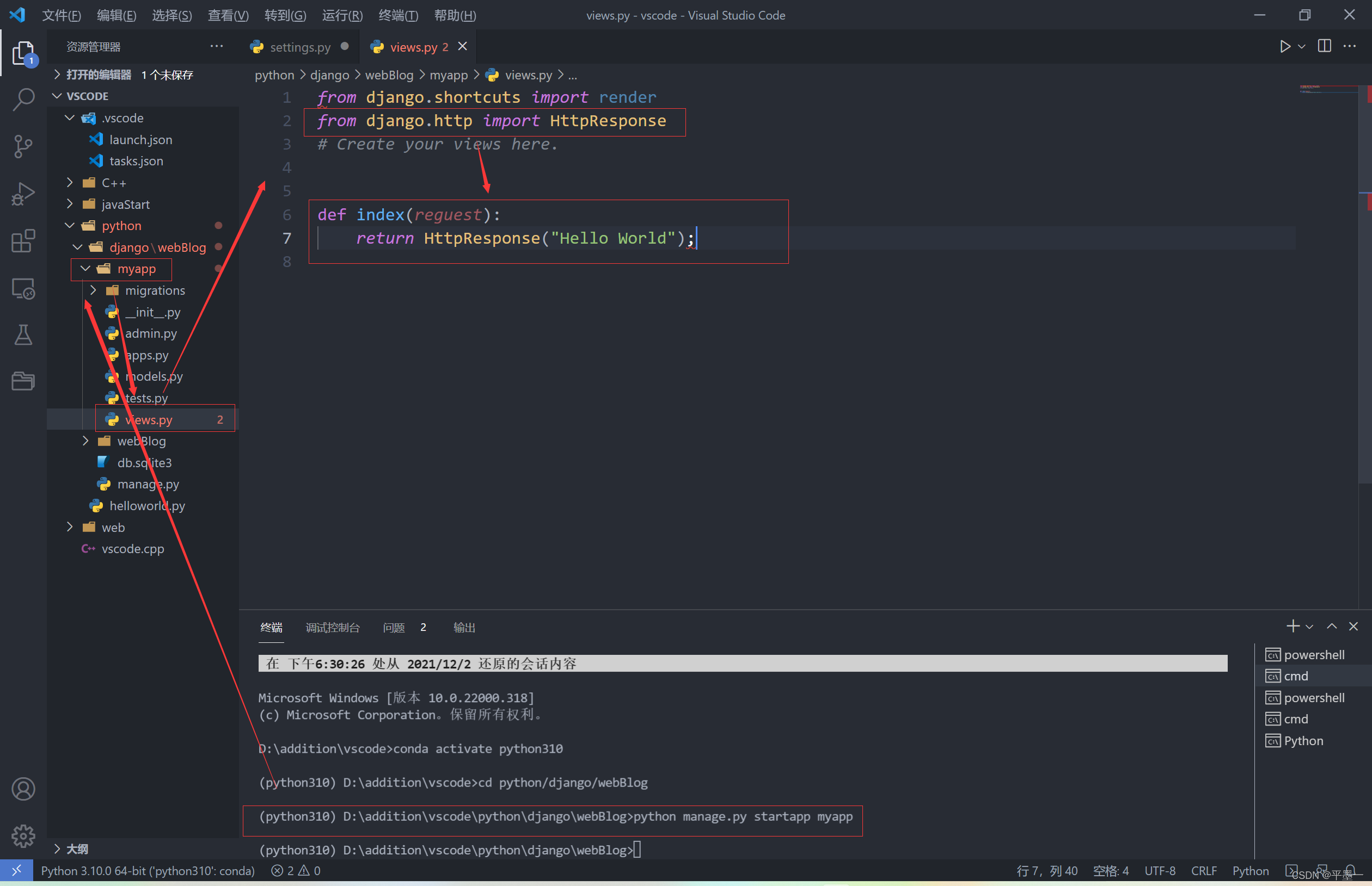 1、在我们的应用文件夹myapp下,找到views.py,添加一个hello world