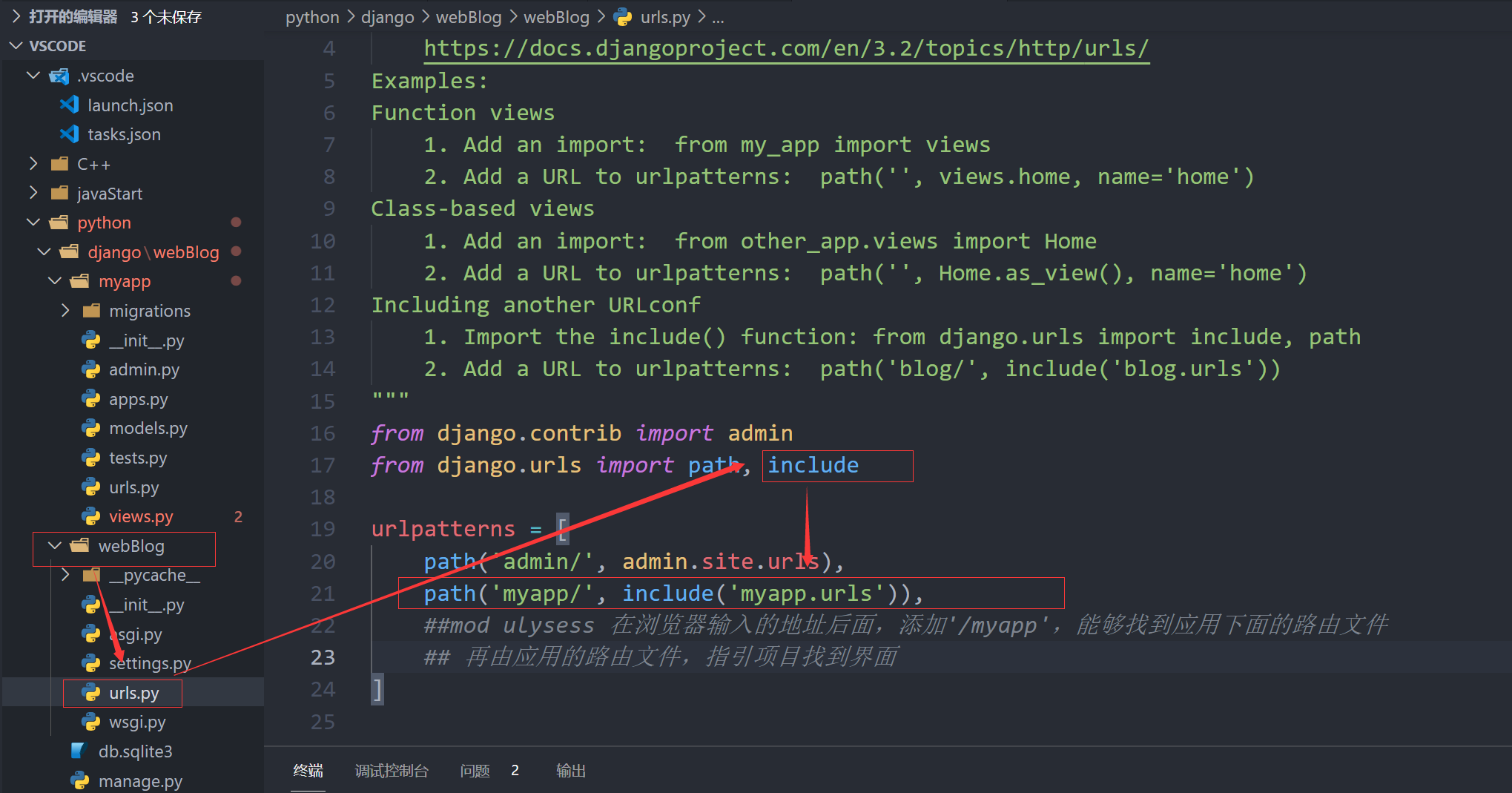 4、到项目下的urls.py总路由文件,添加指令,让项目可以找到,应用的路由文件  ?一旦,当这个urls.py文件被动了,就回不到,django给我们预留的庆祝界面了