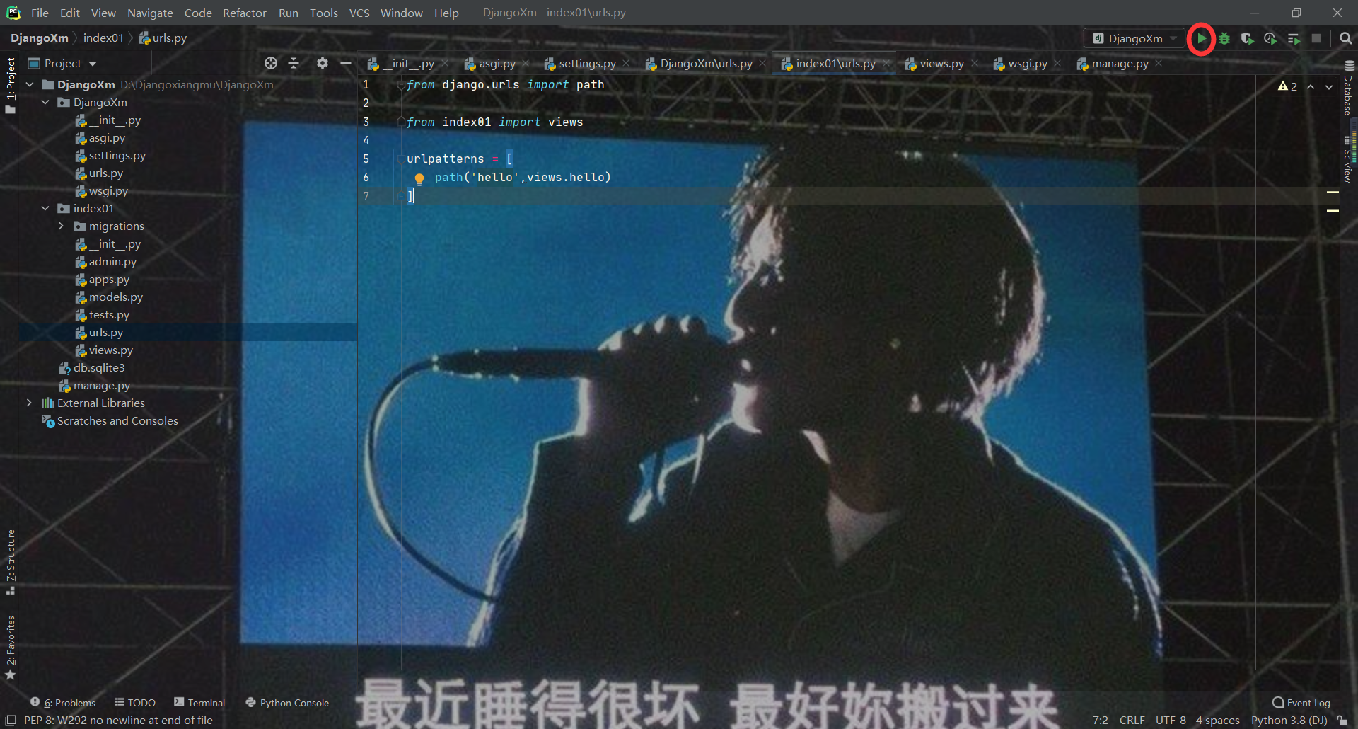 指令:python manage.py startapp 应用名 将上述指令在终端(terminal)输入 进入终端只需要点击一下terminal就好  我以index01作新应用名,本来想用index的,后来出现错误显示是 -